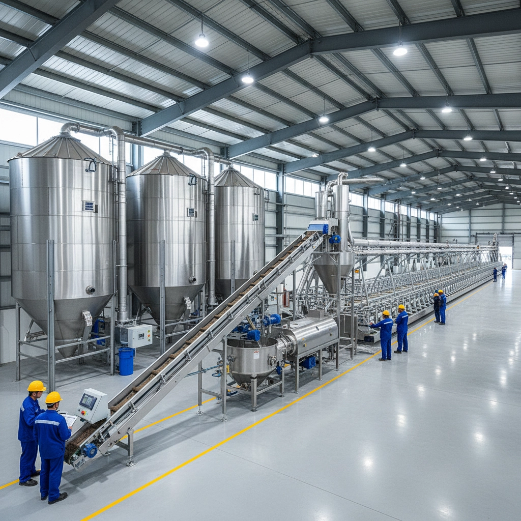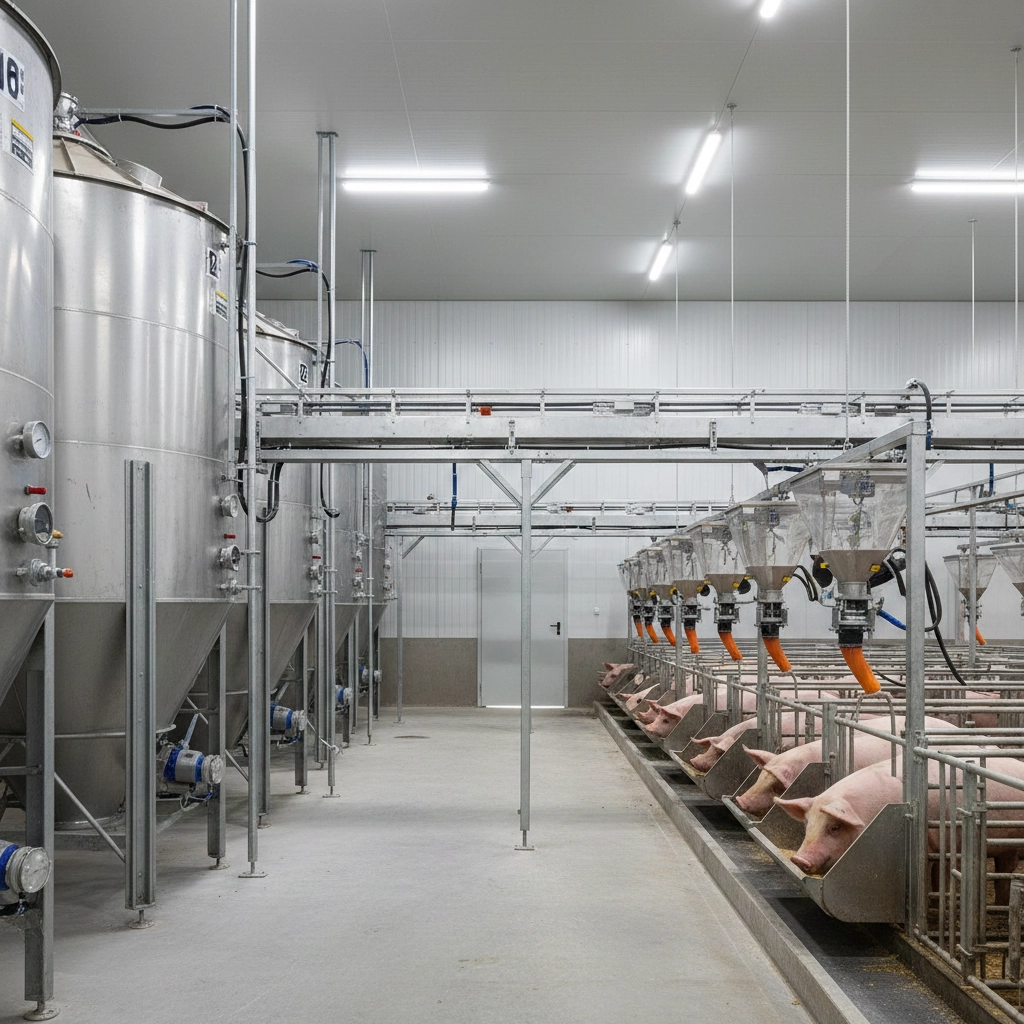 為大型養殖場規劃從儲存桶槽到自動餵飼的輸送系統,解決傳統人工投放不均與浪費的問題。